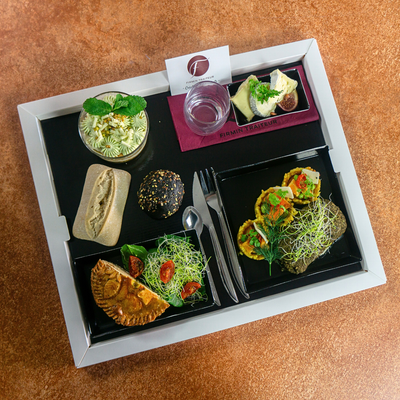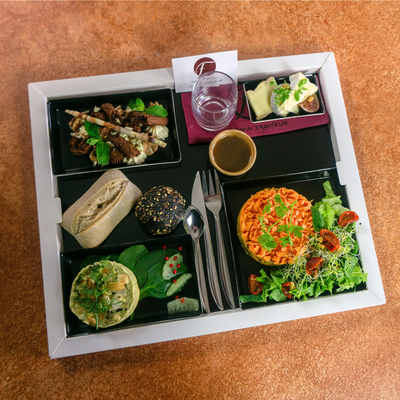 Un menu complet comprenant un petit pain blanc bio et un petit pain céréales bio de notre boulanger local, un petit chocolat produit par notre chocolatier de proximité, des couverts en inox, un gobelet en verre et une serviette en papier.